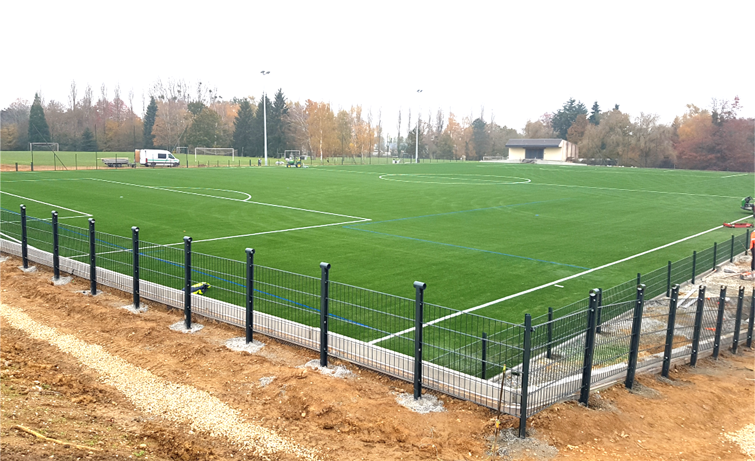 La ville de Mayenne a entrepris la création d’un terrain synthétique, destiné à remplacer le terrain en gazon naturel existant. Ce projet incluait l’agrandissement du terrain, pour l’ajuster aux dimensions de la FFF, avec la création d’un mur de soutènement de 3m de hauteur pour assurer la stabilité du site. L’enjeu écologique était une priorité pour ce projet. En ce sens, afin de limiter l’imperméabilisation des sols, seules les circulations périphériques entre l’accès des joueurs et les vestiaires ont été réalisées en enrobés. Les autres circulations ont été aménagées avec un mélange terre-pierre perméable. Ce choix est d’autant plus significatif que ce terrain est le 1er de la région Pays de la Loire à utiliser des noyaux d’olives comme matériau de remplissage. Les eaux pluviales de drainage ont été infiltrées à la parcelle afin de ne pas surcharger les réseaux via un ouvrage enterré dans l’espace vert au nord-est du terrain. Un autre défi a été la gestion de l’accès au chantier. En raison de l’accès unique du complexe par son entrée principale, une séparation stricte des circulations a été réalisée afin de garantir la sécurité des utilisateurs du complexe pendant les travaux. Les différentes zones du complexe sportif ont ainsi pu continuer à être utilisées tout au long de la durée du chantier.